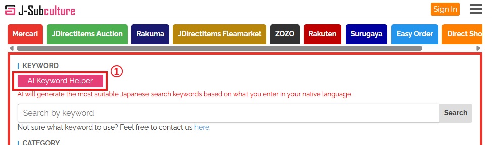 ①: Click on the AI Keyword Helper button to generate Japanese keywords based on your language.