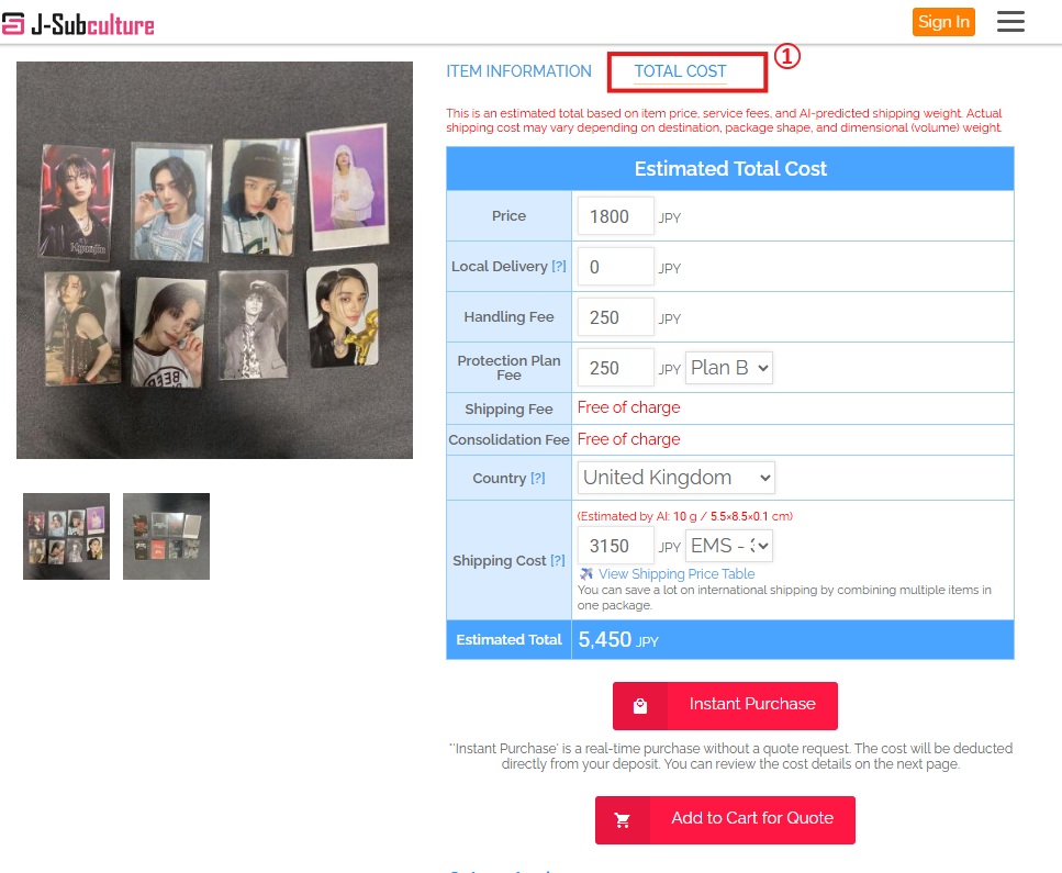 Before placing an order, you can view the total cost—including item price, domestic shipping, service fee, and estimated international shipping.